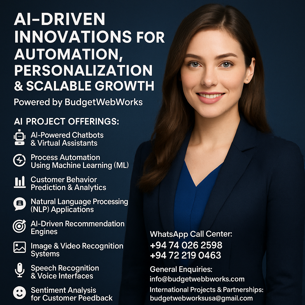 At BudgetWebWorks, we’re revolutionizing the way businesses operate — using Artificial Intelligence to automate, predict, and scale smarter. Whether you’re a startup looking to streamline operations or an enterprise aiming to personalize customer experiences, our AI Projects deliver real-world impact at affordable rates. 🔍 What We Offer – AI Programs by BudgetWebWorks We specialize in end-to-end AI solutions tailored to your business goals. From strategy to deployment — our AI