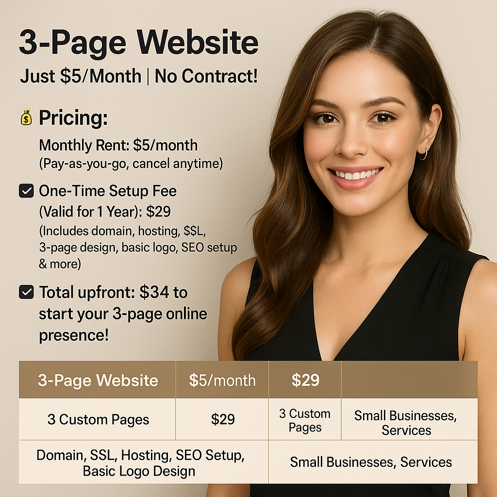 🚀 Launch your 3-page custom website for just $5/month — Includes domain, SSL, hosting, logo & SEO! No contracts. No stress. Perfect for small businesses & services.