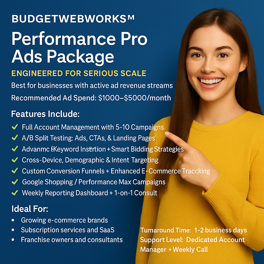 Ready to level up your Google Ads strategy and unlock high-ROI growth? Our Performance Pro Ads Package is engineered for ambitious businesses generating steady ad revenue and aiming to scale aggressively with precision targeting, smart bidding, and full-funnel insights.